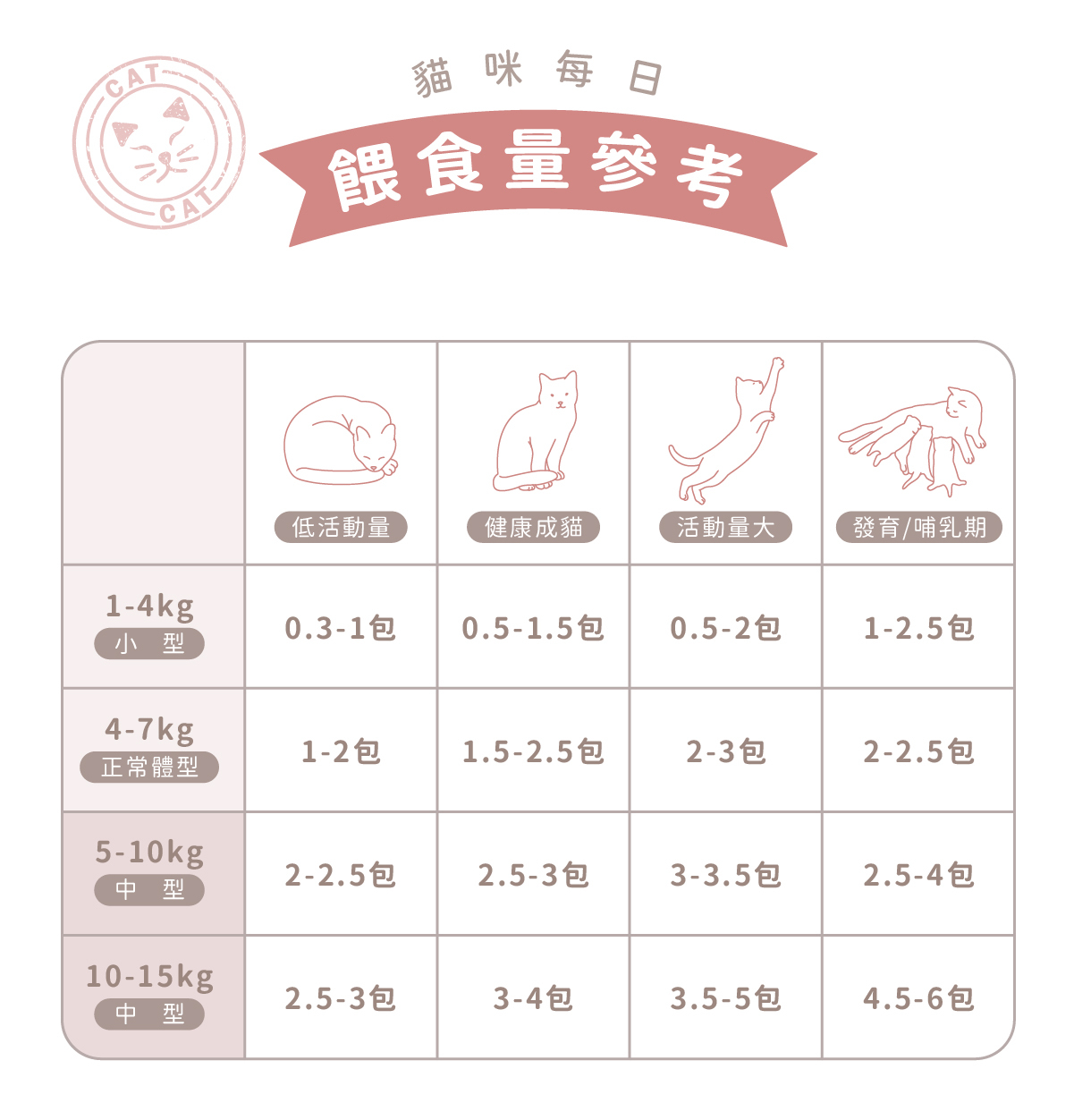 ※每隻毛孩所需的代謝能會因狀態、體態、環境年齡等因素不同而需注意調整,如是哺乳期或成長期的毛孩狀態,則需求量會比建議量高2~3倍。