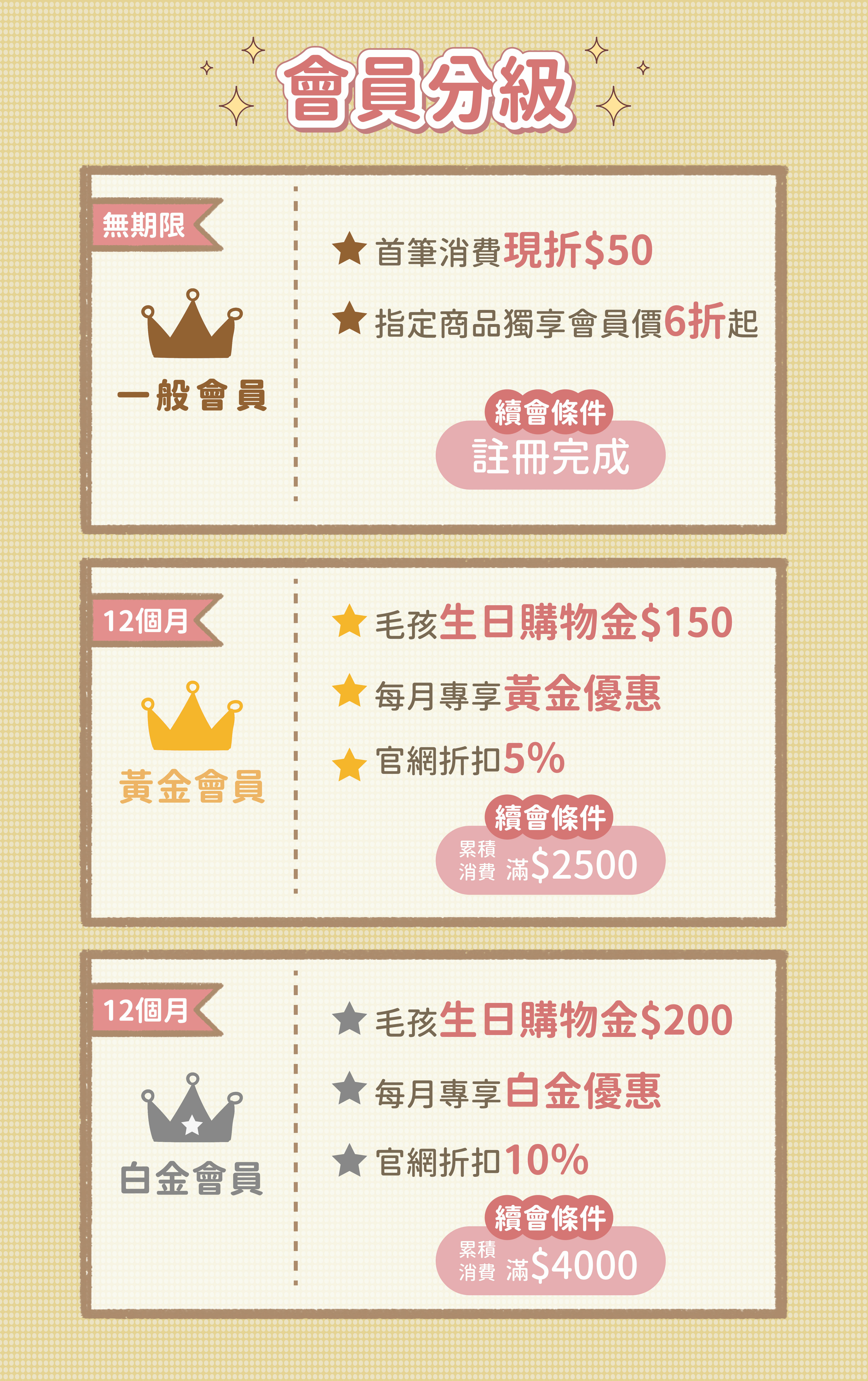 • 高階會員獨享毛孩生日禮金,須請會員至會員帳戶內完成毛孩生日資料填寫,如未完整填寫此欄位則系統會自動"判讀不發放"