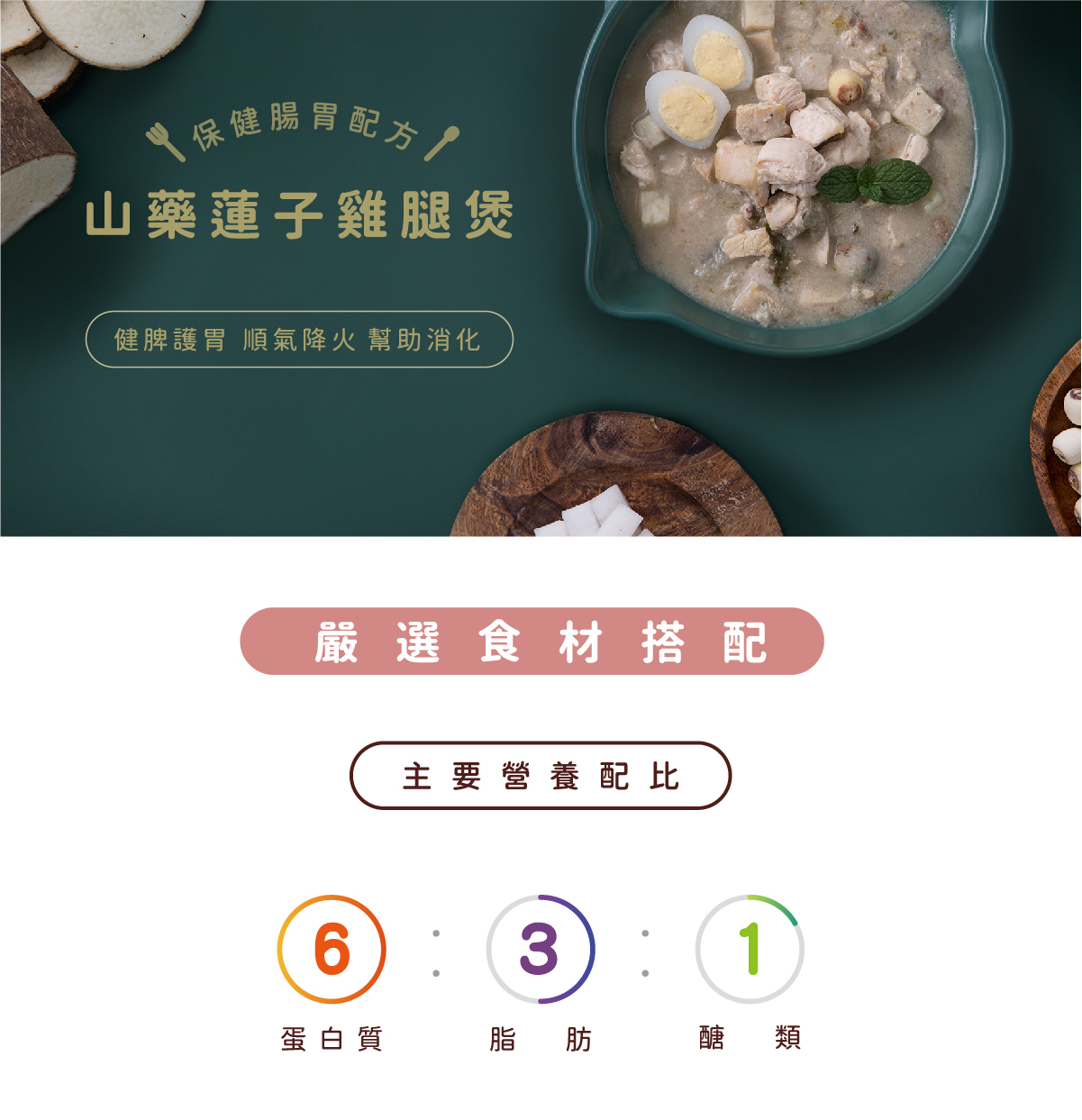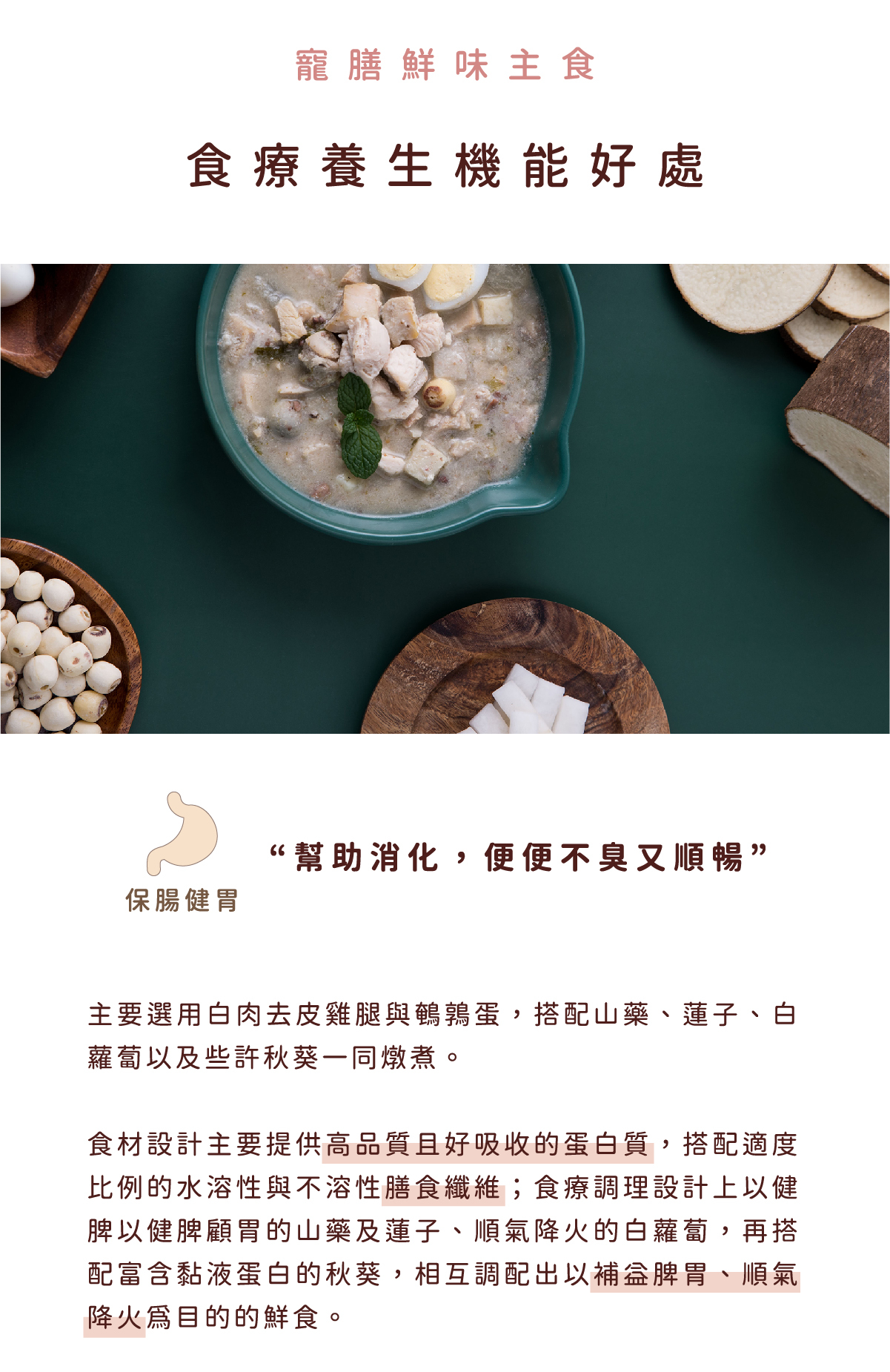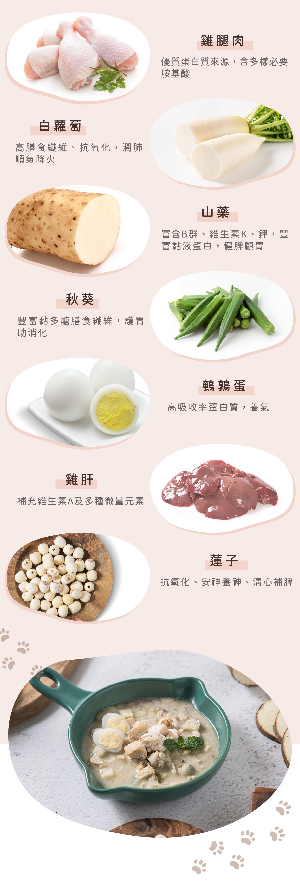 雞腿肉、鵪鶉蛋、雞肝、山藥、白蘿蔔、秋葵、蓮子、秘製柴魚雞湯、初榨椰子油、亞麻仁籽粉、碳酸鈣、魚肉水解胜肽、綜合維生素礦物質