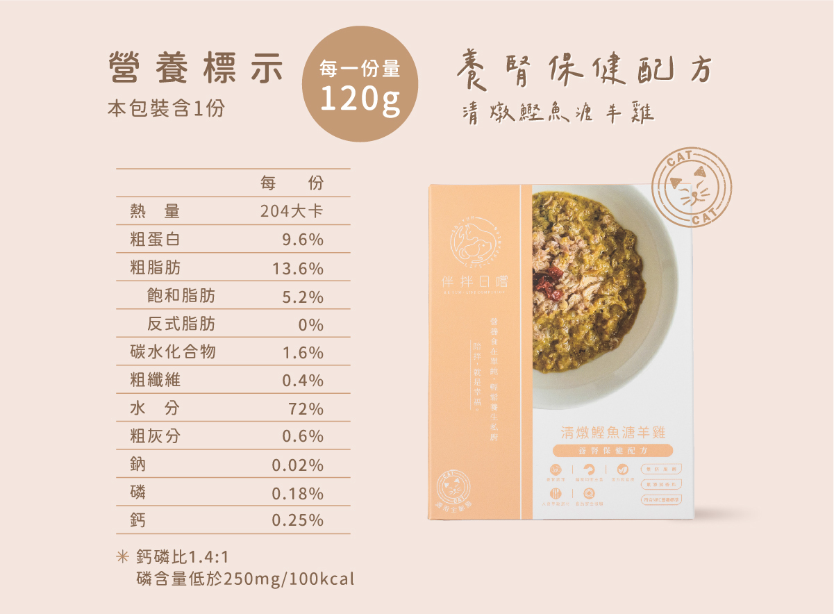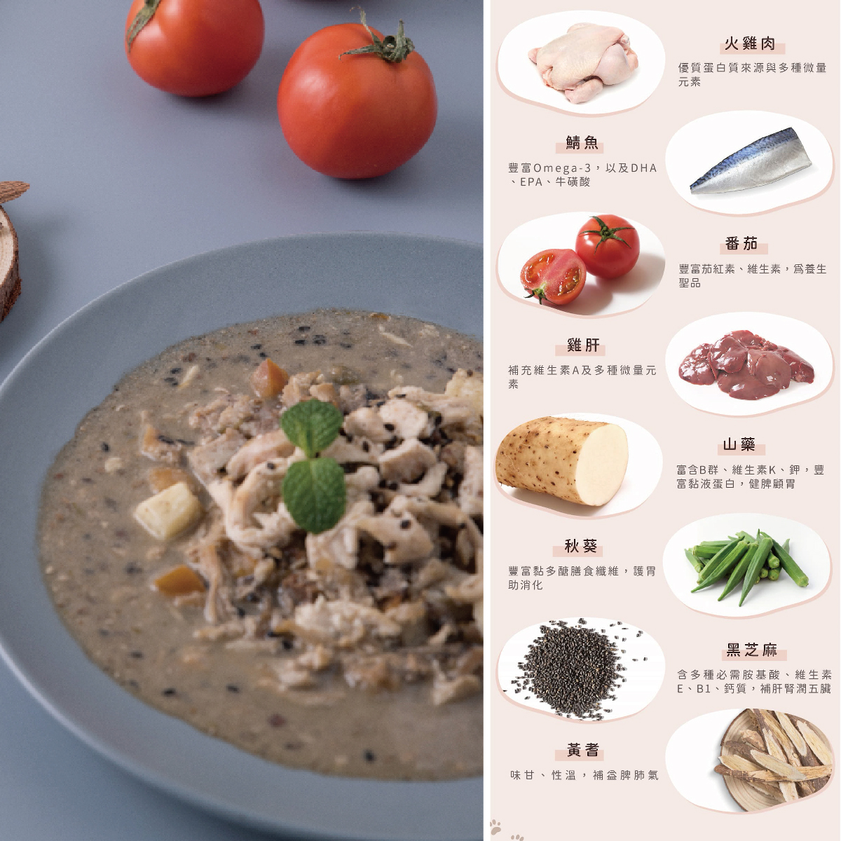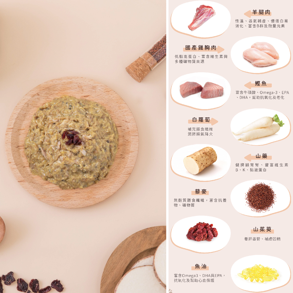 成分 : 羊腿肉、雞胸肉、鰹魚、藜麥、山藥、白蘿蔔、山茱萸、秘製柴魚雞湯、魚油、碳酸鈣、魚肉水解胜肽、牛磺酸、綜合維生素礦物質