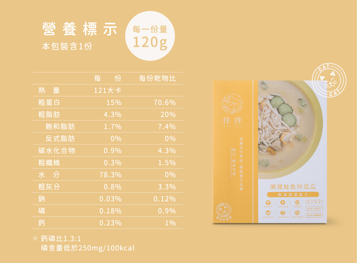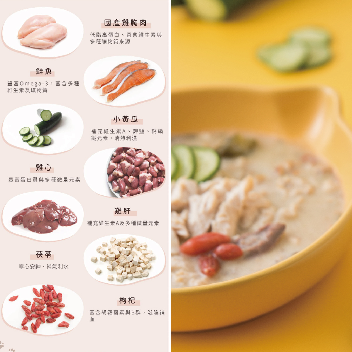 成分 : 雞胸肉、鮭魚、雞心肝、小黃瓜、茯苓、枸杞、秘製柴魚雞湯、初榨椰子油、亞麻仁籽粉、碳酸鈣、魚肉水解胜肽、綜合維生素礦物質