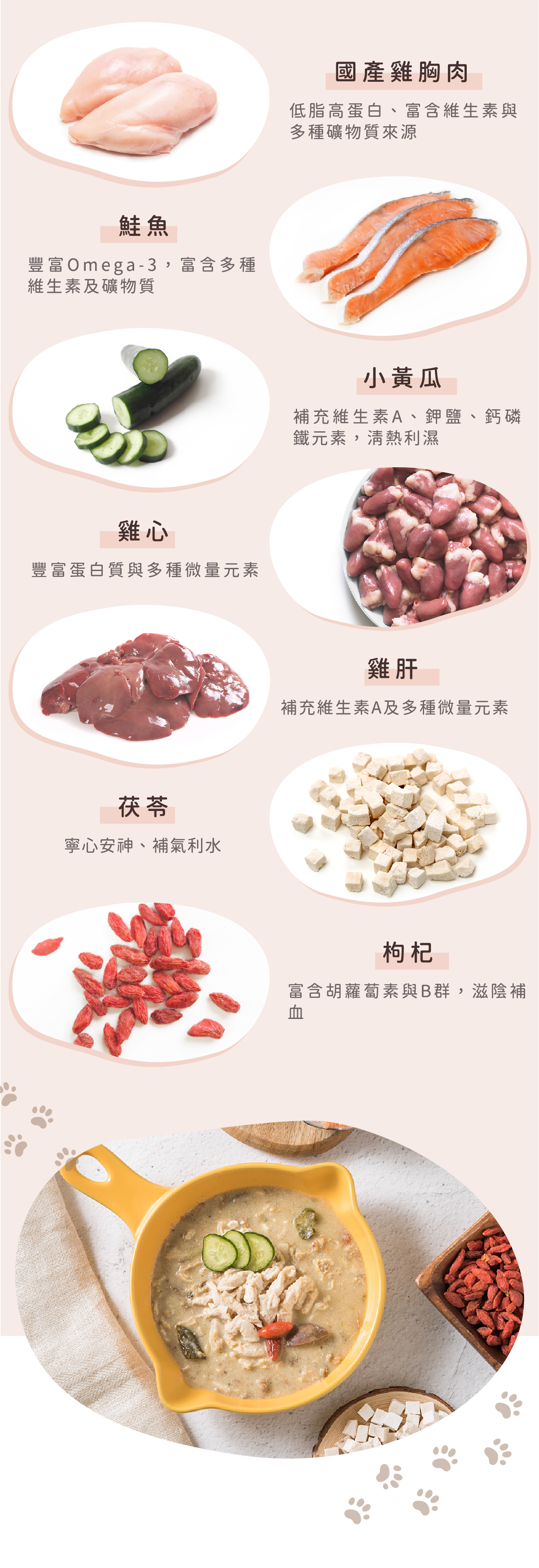 雞胸肉、鮭魚、雞心肝、小黃瓜、茯苓、枸杞、秘製柴魚雞湯、初榨椰子油、亞麻仁籽粉、碳酸鈣、魚肉水解胜肽、綜合維生素礦物質