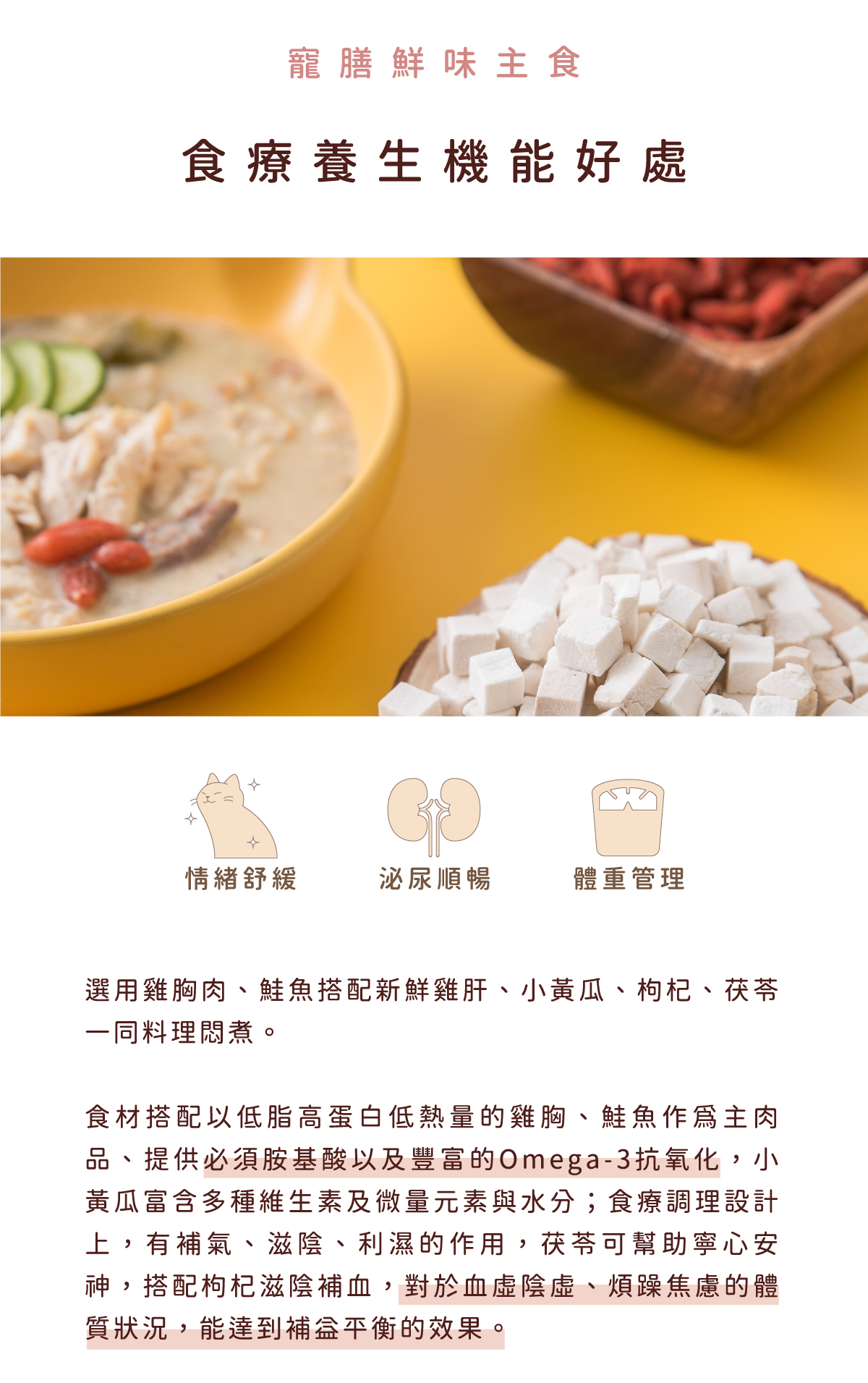 3.寵膳鮮味主食概念為【食療養生】,目的是藉由配方鮮食作為日常調理與保健,而並非"治療"功效,如家中毛孩有任何特殊狀況應先協尋專業獸醫。