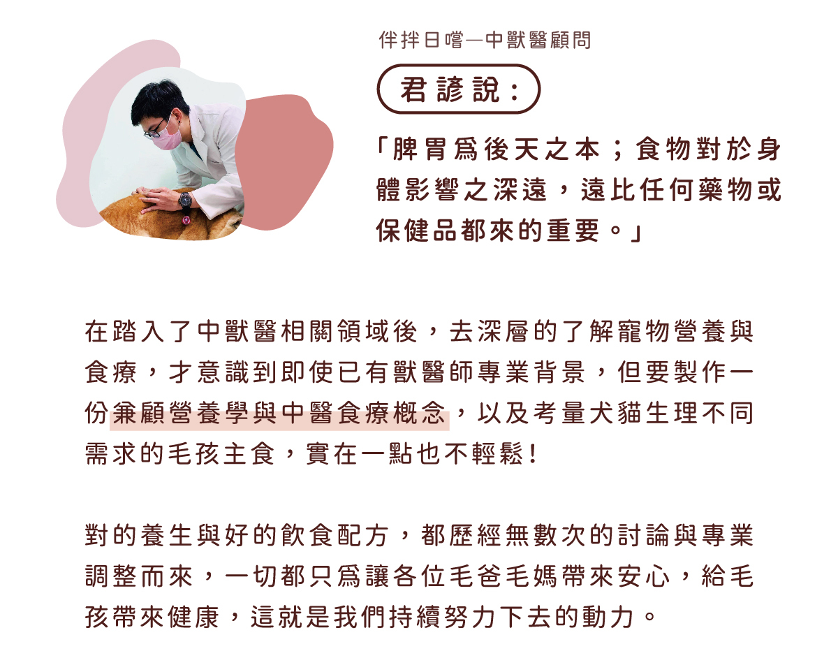 1. 食療養生,漢醫陰陽五行概念,對應毛孩常見症狀作預防調理設計。
